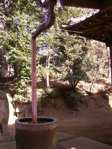 ところでこの神明神社の社殿ですが,なんだか変な柱がありまして,それが下の写真.柱が井戸のような水の溜まったところに突っ込んで建っています.これはちょうど狛犬の後ろの方にあるので,建物の左と右に伸びています.