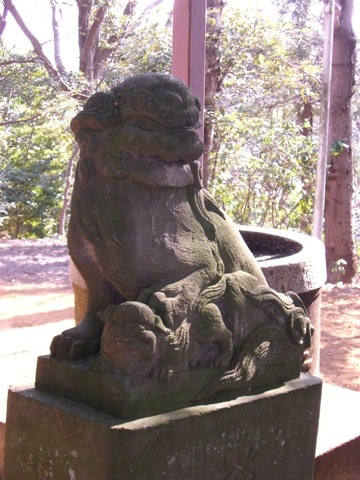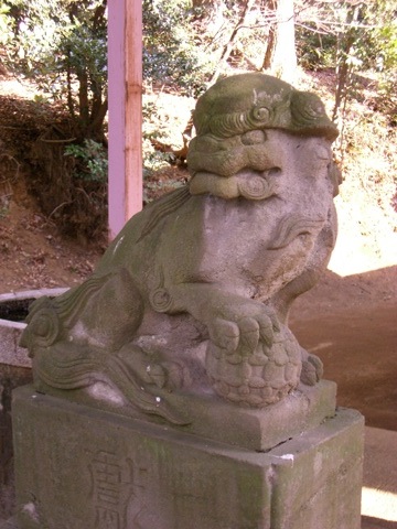 もしかしたら阿と吽で年代違うかな? 玉乗りというか足乗せと子連れタイプですね.階段には他にも二対の狛犬がいましたが,古い物は頭がとれてしまっている二対が置いてありました.尻尾がタケノコみたいに突っ立てて,カポってとれそうなタイプと,新しくてちょっと顔の印象が違うタイプでしたね.