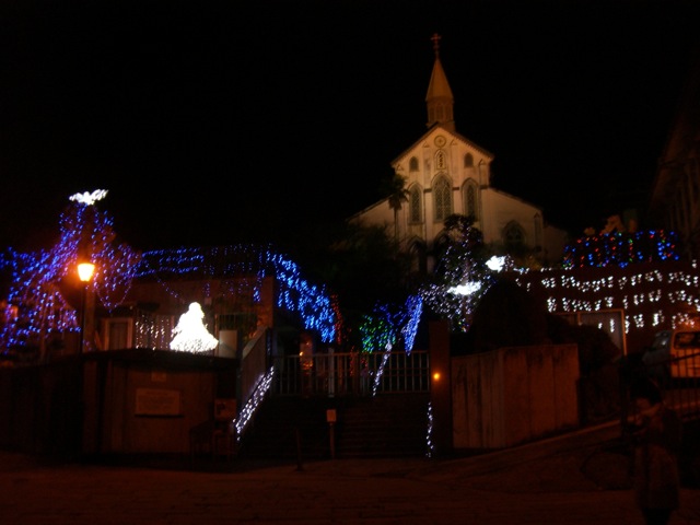 夜にはライトアップされていた大浦天主堂を見に行きました.